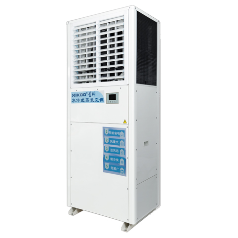首先由外機(jī)采用濕簾蒸發(fā)式冷凝的技術(shù)來(lái)給循環(huán)水降溫,水溫降至常溫后流經(jīng)內(nèi)機(jī)的熱交換系統(tǒng)(此時(shí)壓縮機(jī)已運(yùn)作,已將冷媒壓縮成高溫高壓狀態(tài))從而帶走大部分高溫冷媒的熱量而形成常溫冷媒,常溫冷媒再經(jīng)過(guò)節(jié)流閥后變成低溫低壓的冷媒,輸送至內(nèi)機(jī)上半部分的蒸發(fā)器而吹出冷風(fēng);