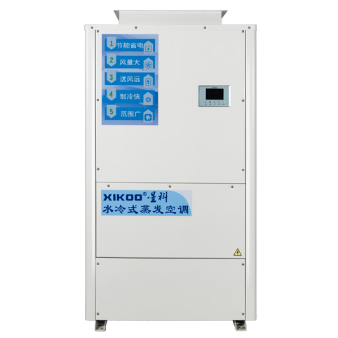 首先由外機采用濕簾蒸發式冷凝的技術來給循環水降溫,水溫降至常溫后流經內機的熱交換系統(此時壓縮機已運作,已將冷媒壓縮成高溫高壓狀態)從而帶走大部分高溫冷媒的熱量而形成常溫冷媒,常溫冷媒再經過節流閥后變成低溫低壓的冷媒,輸送至內機上半部分的蒸發器而吹出冷風;