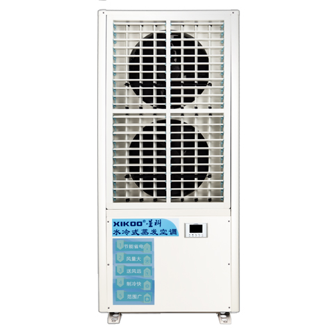 首先由外機(jī)采用濕簾蒸發(fā)式冷凝的技術(shù)來給循環(huán)水降溫,水溫降至常溫后流經(jīng)內(nèi)機(jī)的熱交換系統(tǒng)(此時(shí)壓縮機(jī)已運(yùn)作,已將冷媒壓縮成高溫高壓狀態(tài))從而帶走大部分高溫冷媒的熱量而形成常溫冷媒,常溫冷媒再經(jīng)過節(jié)流閥后變成低溫低壓的冷媒,輸送至內(nèi)機(jī)上半部分的蒸發(fā)器而吹出冷風(fēng);
